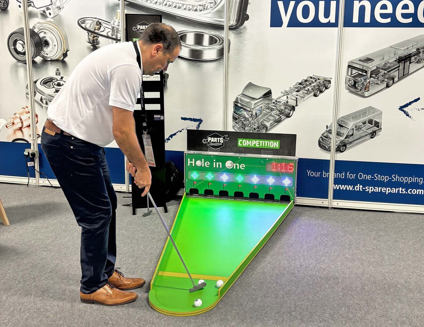 Uno spazio di divertimento nello stand è stato creato attraverso il gioco golfistico del putt rapido. Il gioco ha messo alla prova le capacità dei visitatori. Con un pizzico di fortuna, alcuni si sono aggiudicati dei bei premi. Per esempio, ogni giorno sono stati estratti a sorte due buoni premio. Inoltre, tutti gli utenti appena iscritti al Premium Shop hanno potuto aggiudicarsi un altro regalo. Hanno ricevuto la lunchbox a marchio DT Spare Parts. Per giunta, hanno avuto l'opportunità di vincere due biglietti per la gara di camion presso il circuito di Donington.